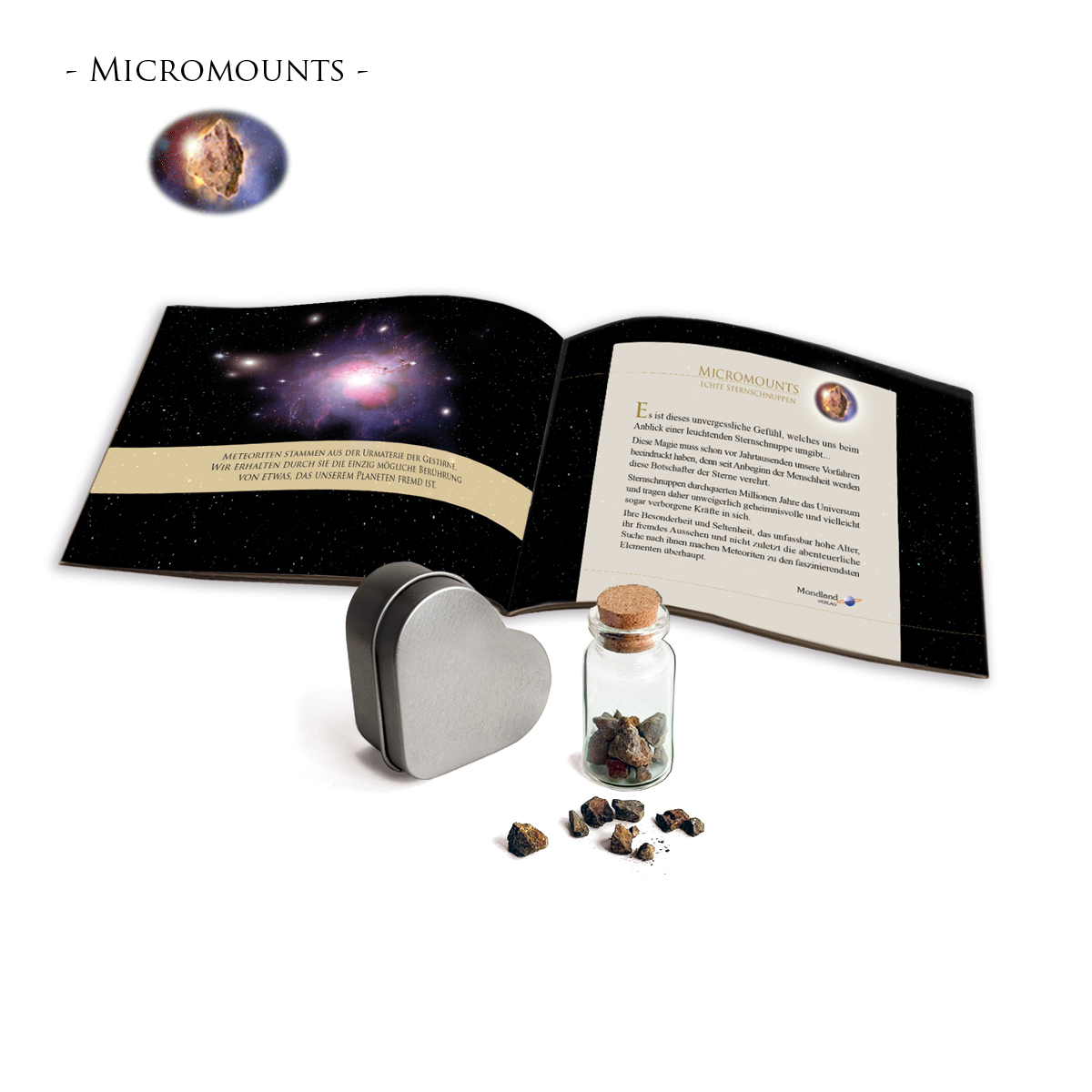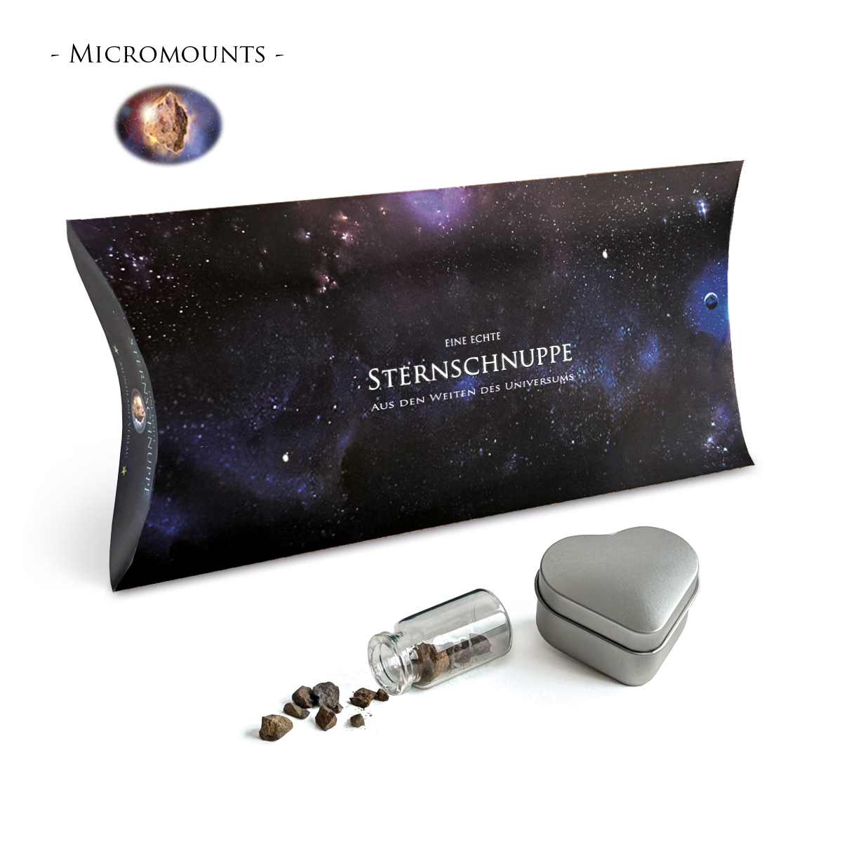 Als Geschenkset es eine Glasphiole, in der sich kleine, echte Sternschnuppen befinden. Die Meteoriten in der Glasphiole verschenken Sie in einem seidenen Schnurbeutelchen. Mit Begleitkarte zum Geschenk und ausführliche Infos zu den Sternschnuppen. Die Phiole lässt sich am Korken öffnen. Je nach Größe befinden sich jeweils 4-7 sogenannte Micromounts, in der Phiole aus Glas.